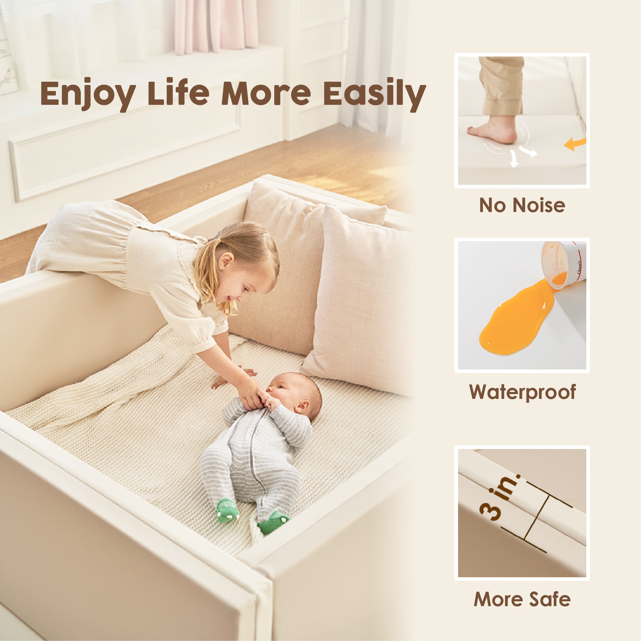 - Elevate Your Space with Luxury: Immerse your home in modern elegance with the mat’s minimalist design and neutral colors. The faux leather cover not only adds a touch of premium luxury but seamlessly blends into the aesthetics of any modern home, making it a stylish addition to your child’s play area.